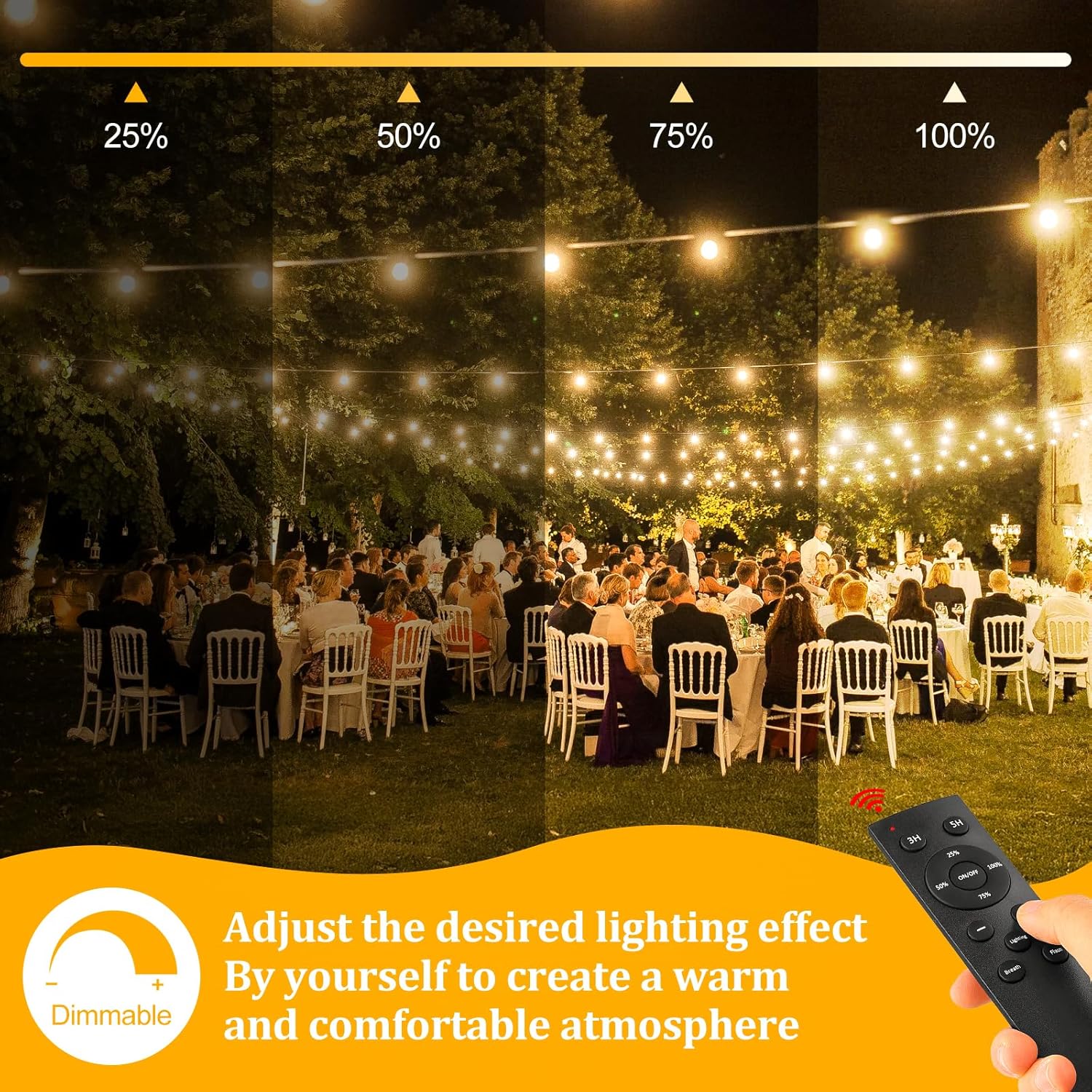 • WITH 4 ADJUSTABLE BRIGHTNESS LEVELS: The dimmable festoons lights let you customize the lighting to fit your needs. Whether for a romantic dinner or lively celebration, you can easily dim or brighten the lights for any occasion. This flexibility enhances your outdoor space’s aesthetic and promotes energy efficiency by using just the right amount of light
